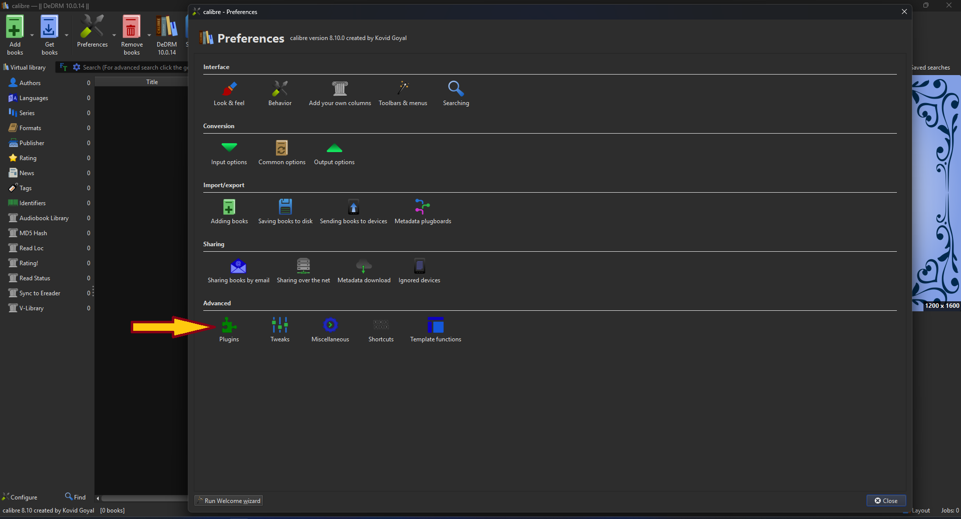 In Calibre, click on the "Preferences" button in the toolbar (highlighted with the red arrow in the screenshot). This will open the Preferences window where we can manage plugins and other settings.