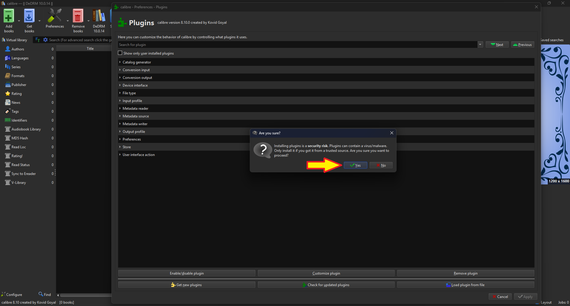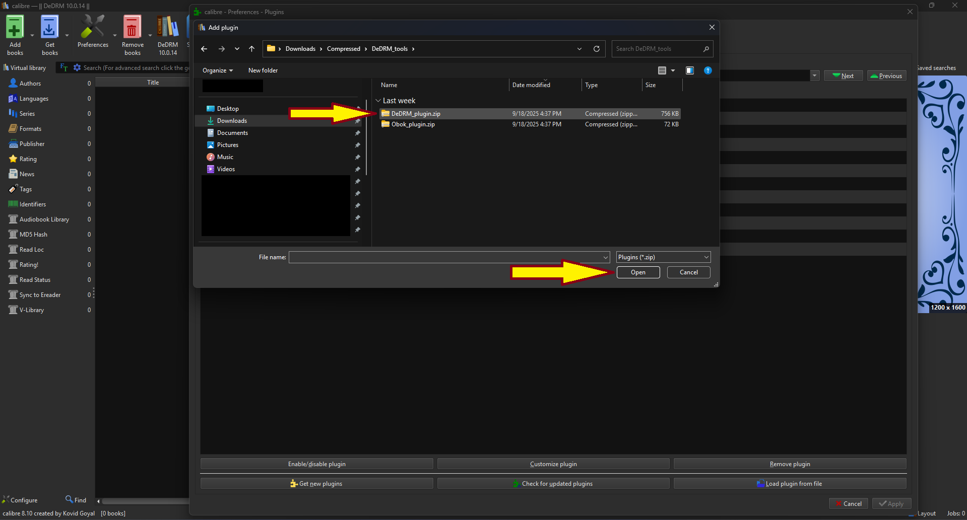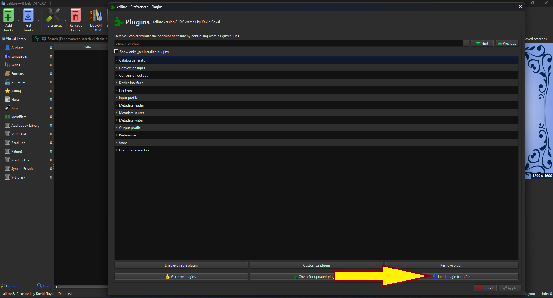 In the Preferences window, look for the "Load Plugin from file" section at the bottom. Click on it to load the file we extracted from DeDRM_tools.zip this is how we install plugins that are NOT available via the Calibre store due to legal requirements.