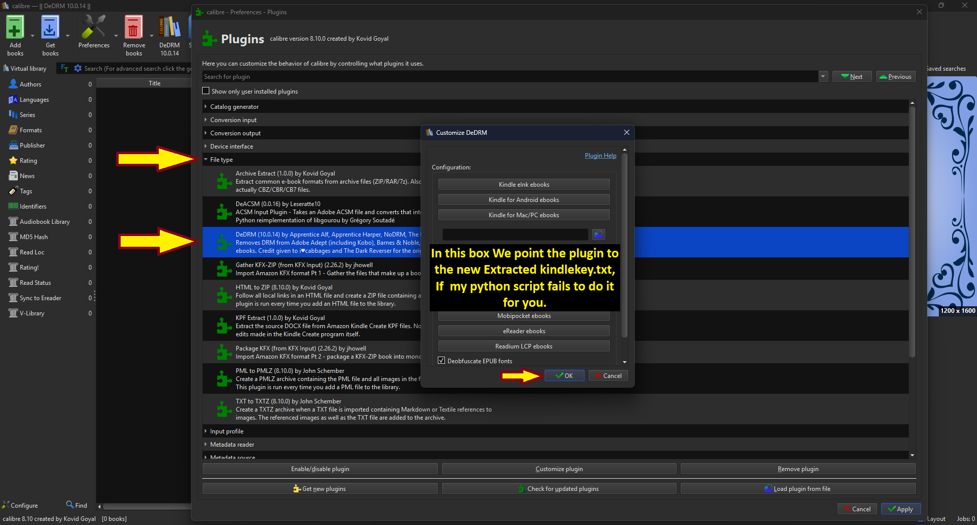 After restarting if you look again under Calibre Preferences / Plugins / File Type >>> You will see the new Plugin DeDRM v10.0.14 Installed, if you Double Click it, you will open the configuration section Unfortunately at this point we do not yet have the needed files to add to this screen, but if my script runs without issues this will be populated for you, in the event is not, well you know where to come to do it manually.
