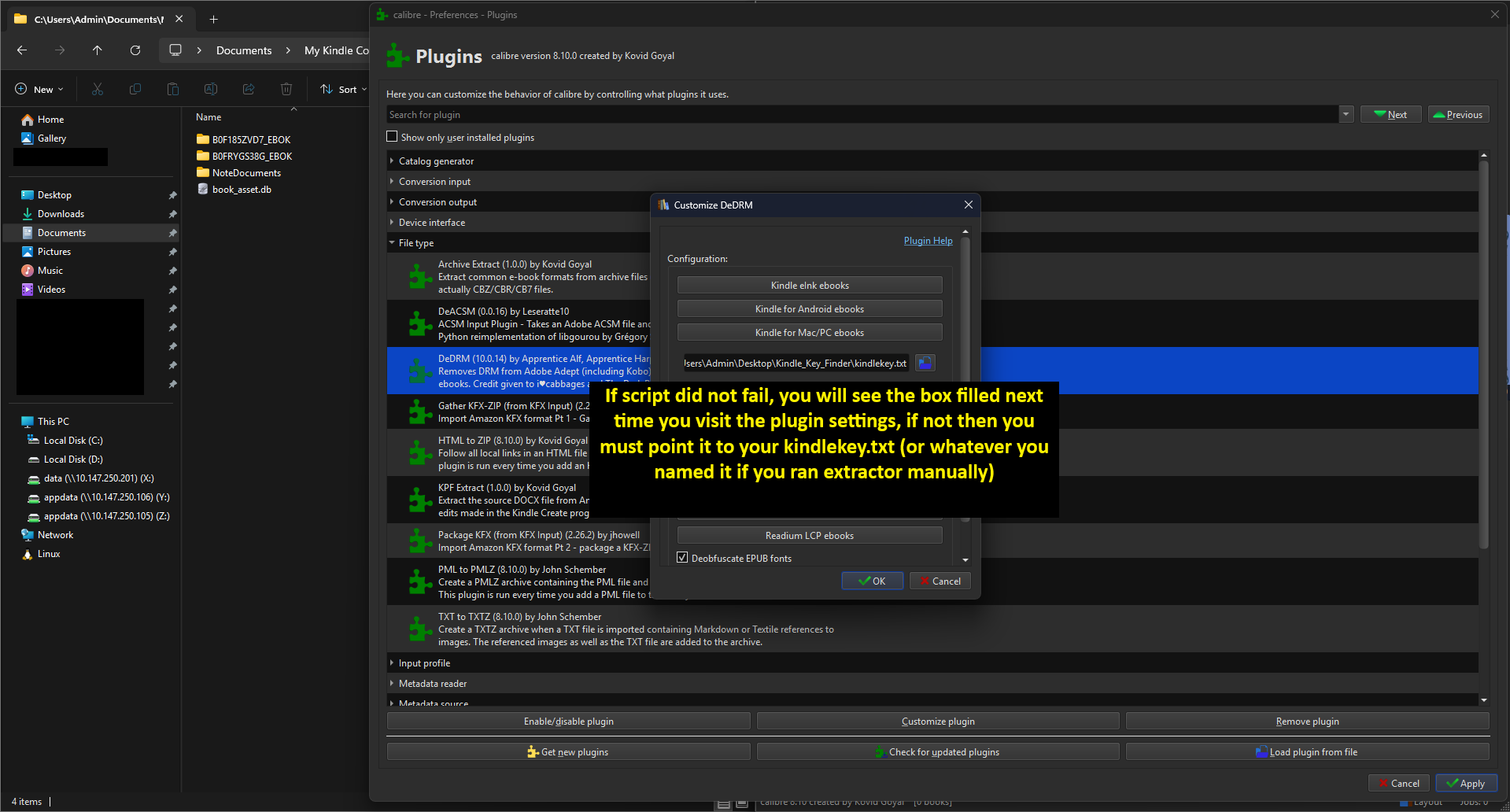 The screenshot shows the path to where books are downloaded and the content of the script and KFXKeyExtractor28.exe from the DeDRM folder.