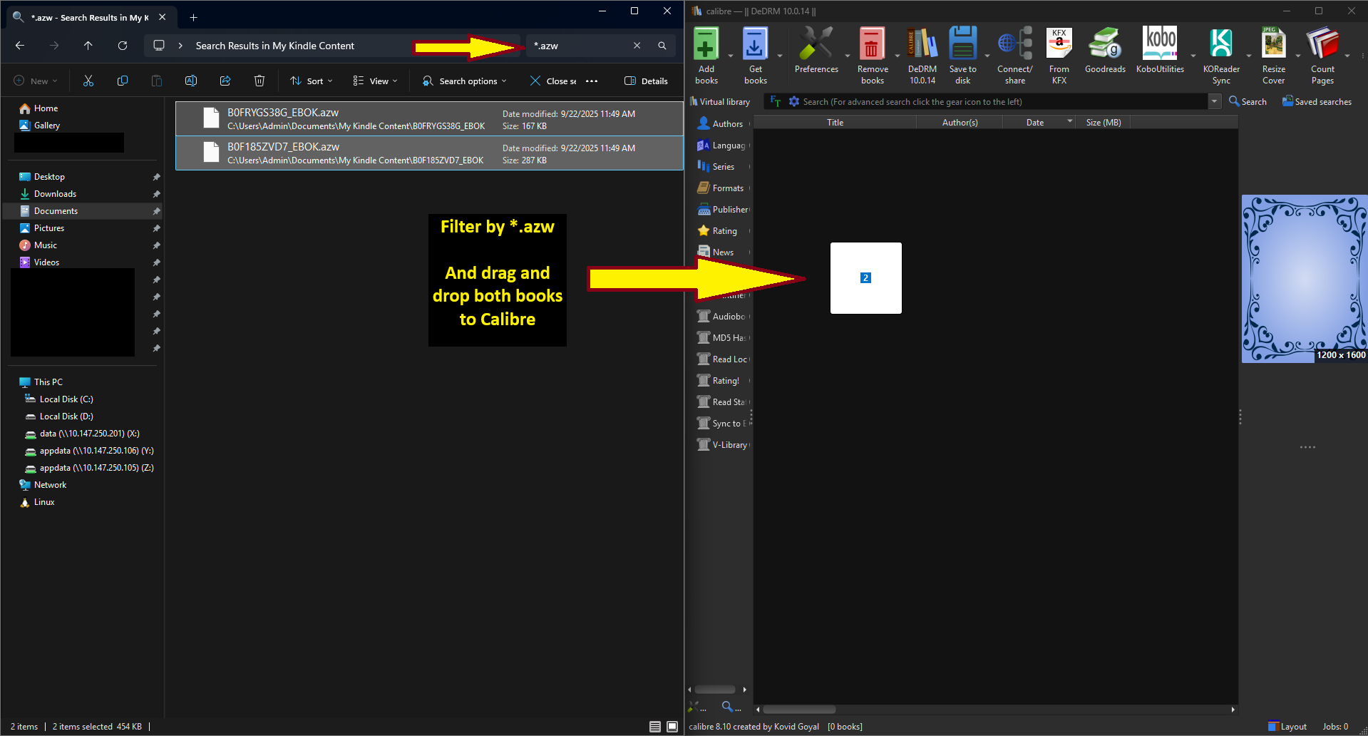 Add our new DRM-protected Kindle books to your Calibre library (Drag and Drop works best for me). If everything is configured correctly and Keys where successfully extracted, the DeDRM plugin will automatically remove the DRM protection when you import the book. You will endup with a books in Calibre in KFX format, that you can then convert to EPUB.